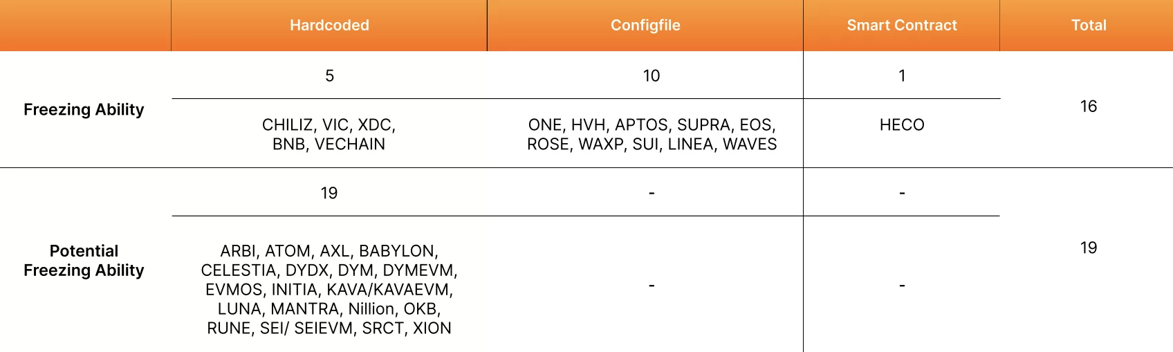 - Major chains, including BNB, VeChain, and CHILIZ, can perform hard-coded freezing