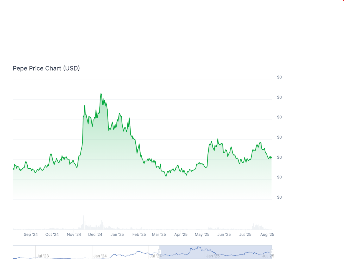 PEPE evolved from a satirical token to a $5 billion blue-chip memecoin, embodying crypto’s internet-native culture. Its frog mascot is unique and instantly recognizable, fueling organic hype across online platforms and decentralized exchanges.