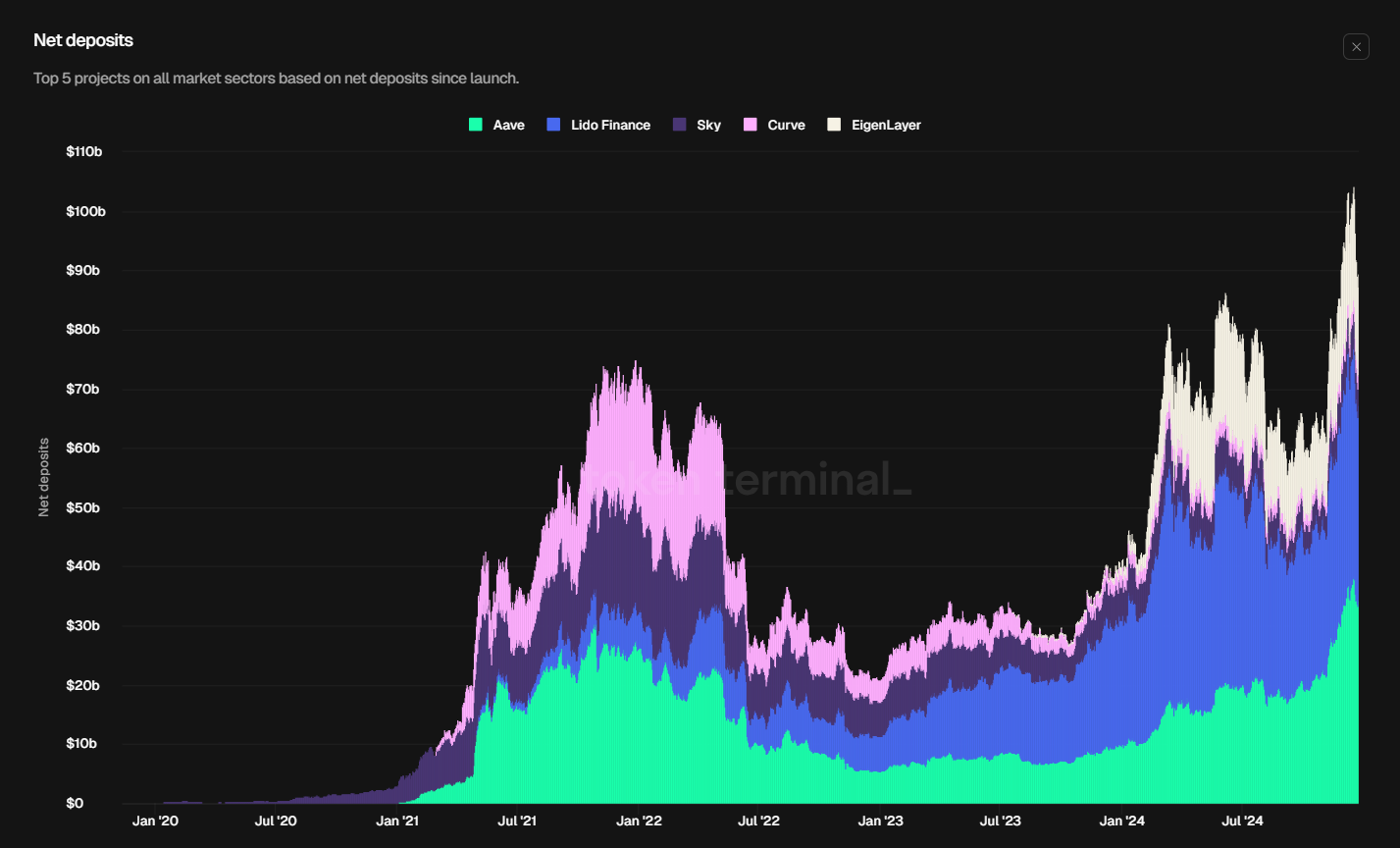 Aave and Lido surpass $70b in combined net deposits, leads the DeFi ecosystem
