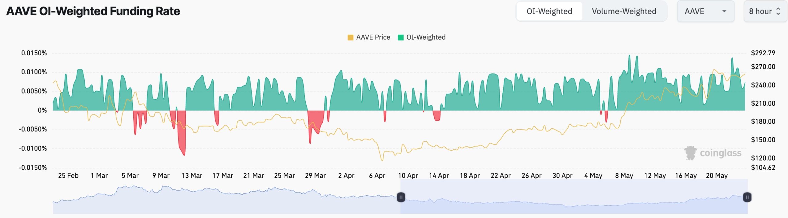 As the chart below shows, AAVE has had a positive funding rate since May 6, a sign that investors anticipate its future price to be higher than the spot one.