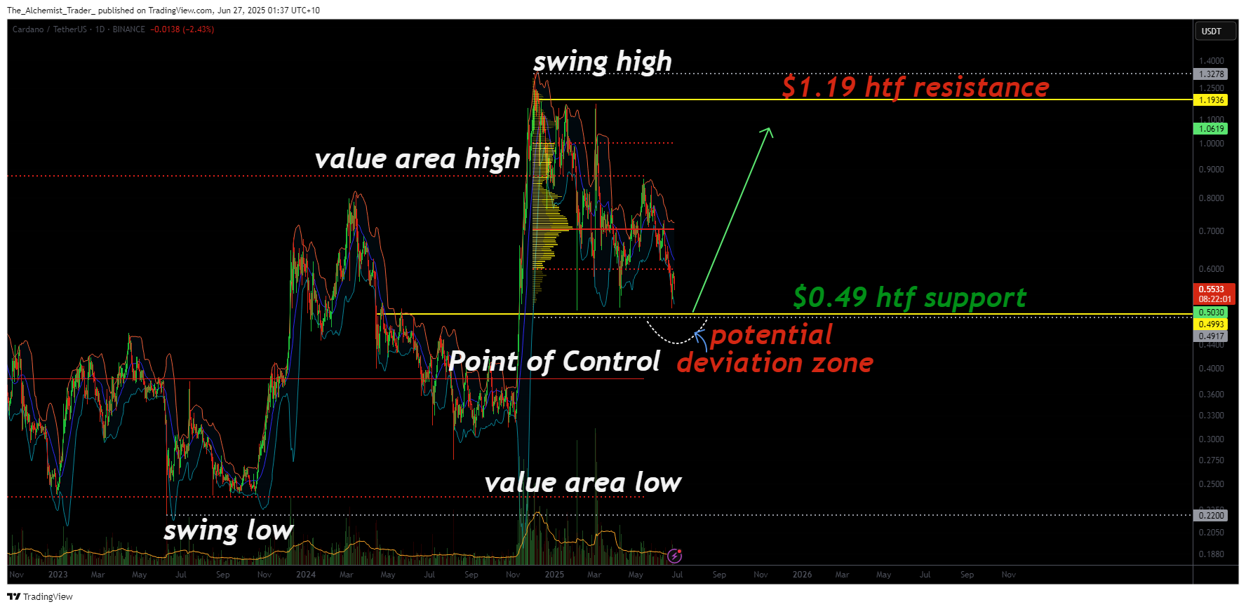 - $0.49 Support Zone: Daily support, swing low, and value area low all converge at this level.