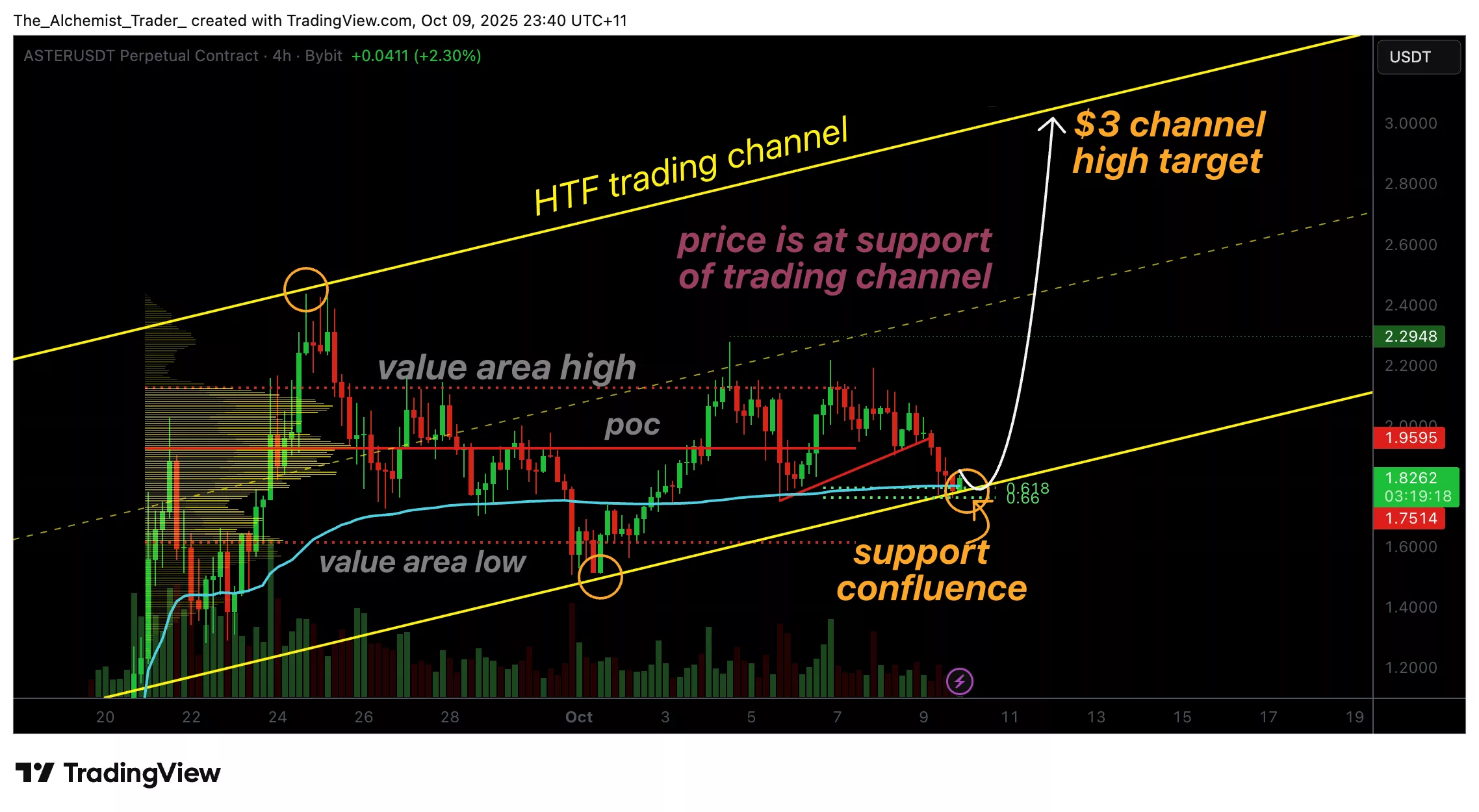 The Aster (ASTER) recent price pullback has brought it to a structurally important support zone at $1.70, a region that has historically acted as a launch point for major bullish moves. The asset is trading within a higher time frame ascending channel, where each corrective phase has consistently led to the formation of a higher low before continuing.