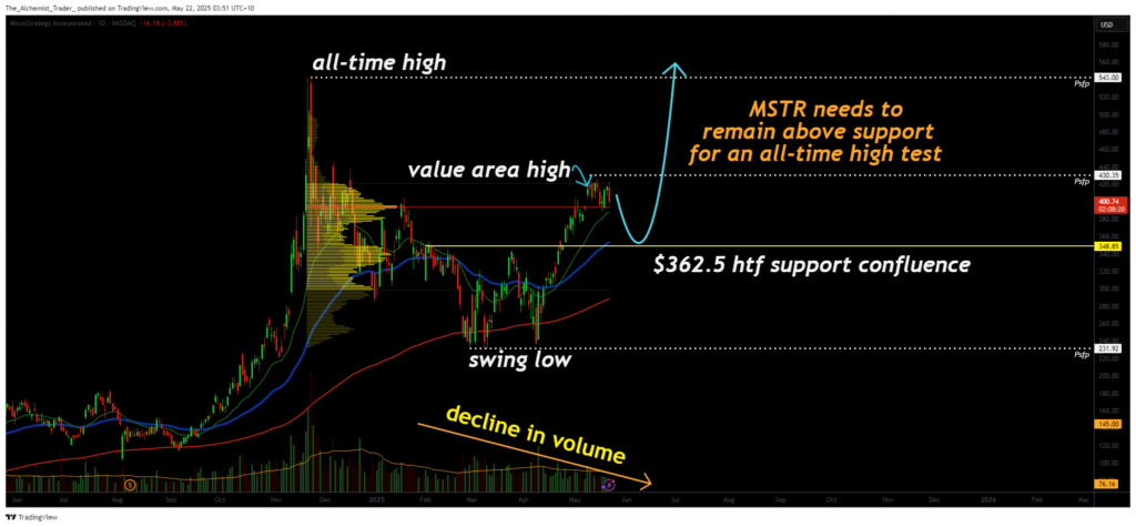 Importantly, a breakout above the current high without a correction would also signal strong bullish momentum. It would suggest continued buying pressure and increase the likelihood of price rotation into discovery mode and the formation of new all-time highs, similar to Bitcoin’s recent breakout. MSTR’s historical price action has often mirrored that of Bitcoin, and this technical alignment reinforces the bullish outlook.