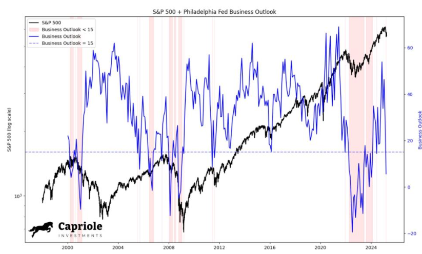 The Business Outlook Survey from the Philadelphia Federal Reserve, which has now fallen below 15 for the first time since early 2024, is a worrying indicator. In the past, a dip such as this has reflected pessimism among business leaders — a metric closely watched by market analysts. Edwards noted that although this data occasionally sends mixed signals, the current readings add to a broader climate of financial caution.