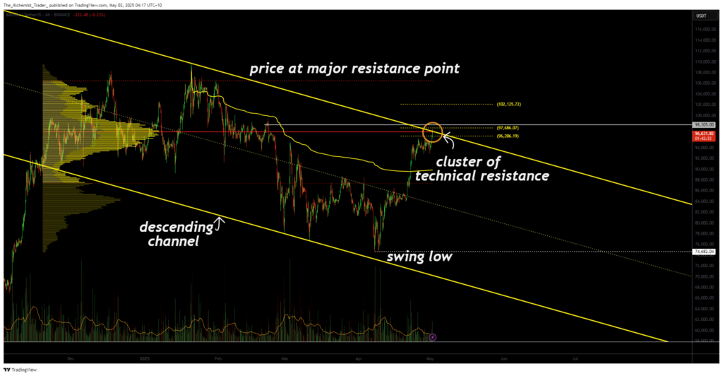 Now, Bitcoin is testing several key resistance levels in one cluster. The most important of these include the $98,300 level, the descending trendline that has defined recent price action, and the 0.618 Fibonacci retracement from the previous swing high.
