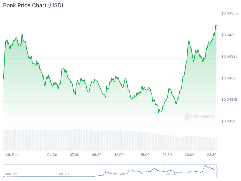 The recent surge was after a community-driven token burn and price increase. Bonk’s (BONK) price of $0.00000328 marks a 3.9% rise over the past 24 hours and a 4.9% increase over the week.