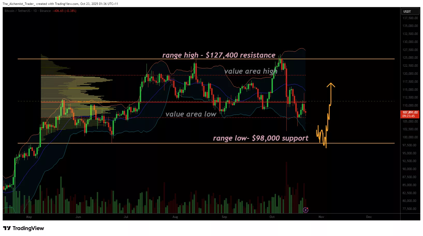 Bitcoin’s current price structure highlights a prolonged phase of sideways movement following a rejection at the $127,400 range high, where heavy supply and profit-taking activity emerged. The rejection triggered a pullback first toward the range midpoint and now toward the value area low, where the price is attempting to stabilize near $98,000.