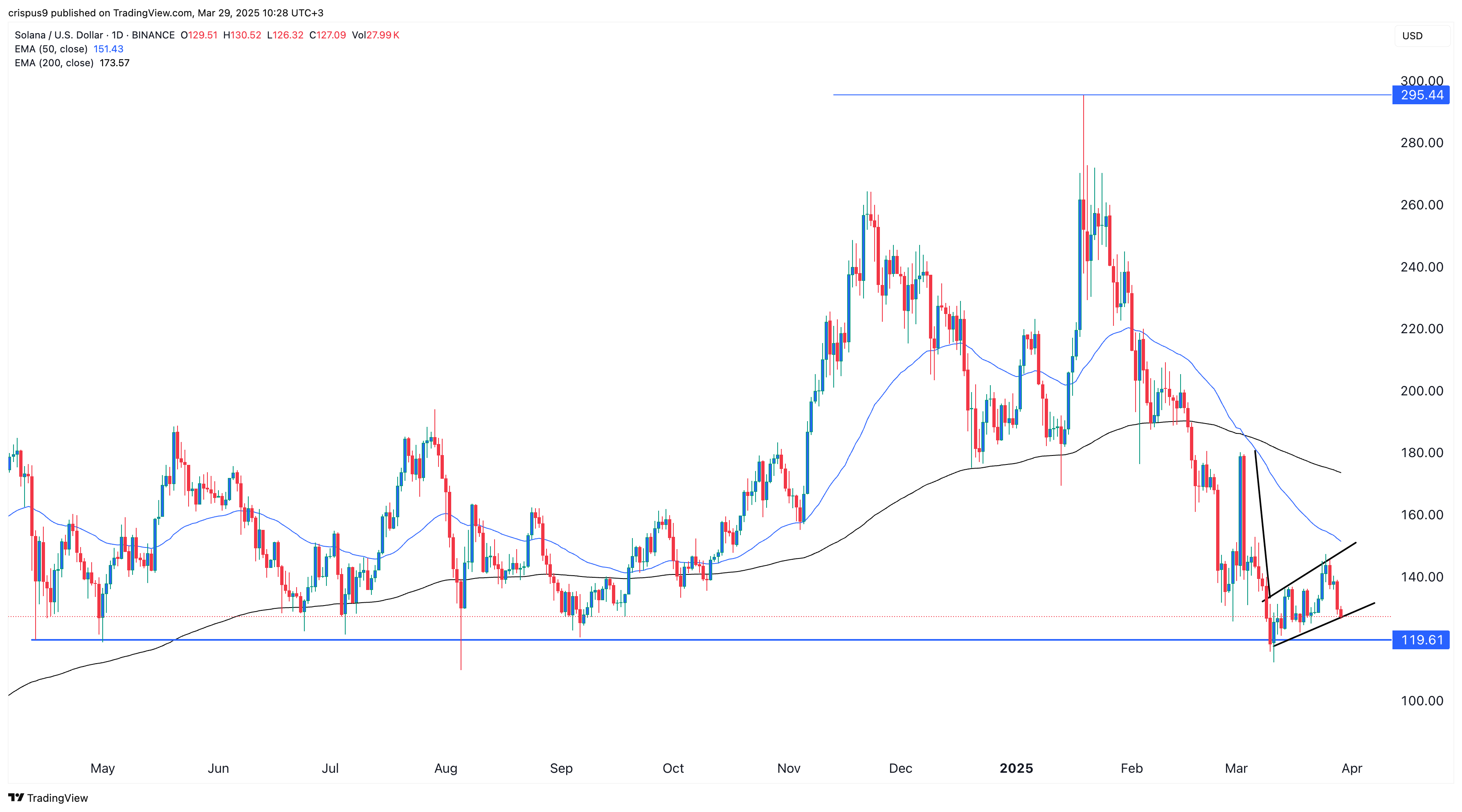 The daily chart shows that Solana coin has plunged in the past few months, moving from January’s high of $295.45 to $126. Most recently, it has formed a bearish flag pattern, which is made up of a tall vertical line and a rectangle.