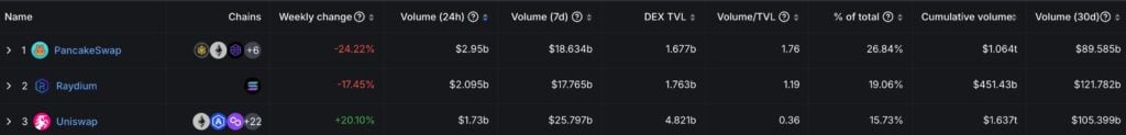 PancakeSwap has also maintained its market share in the decentralized exchange industry. DeFi Llama data shows that it handled the most volume in the last 24 hours, flipping top DEX networks like Raydium and Uniswap.