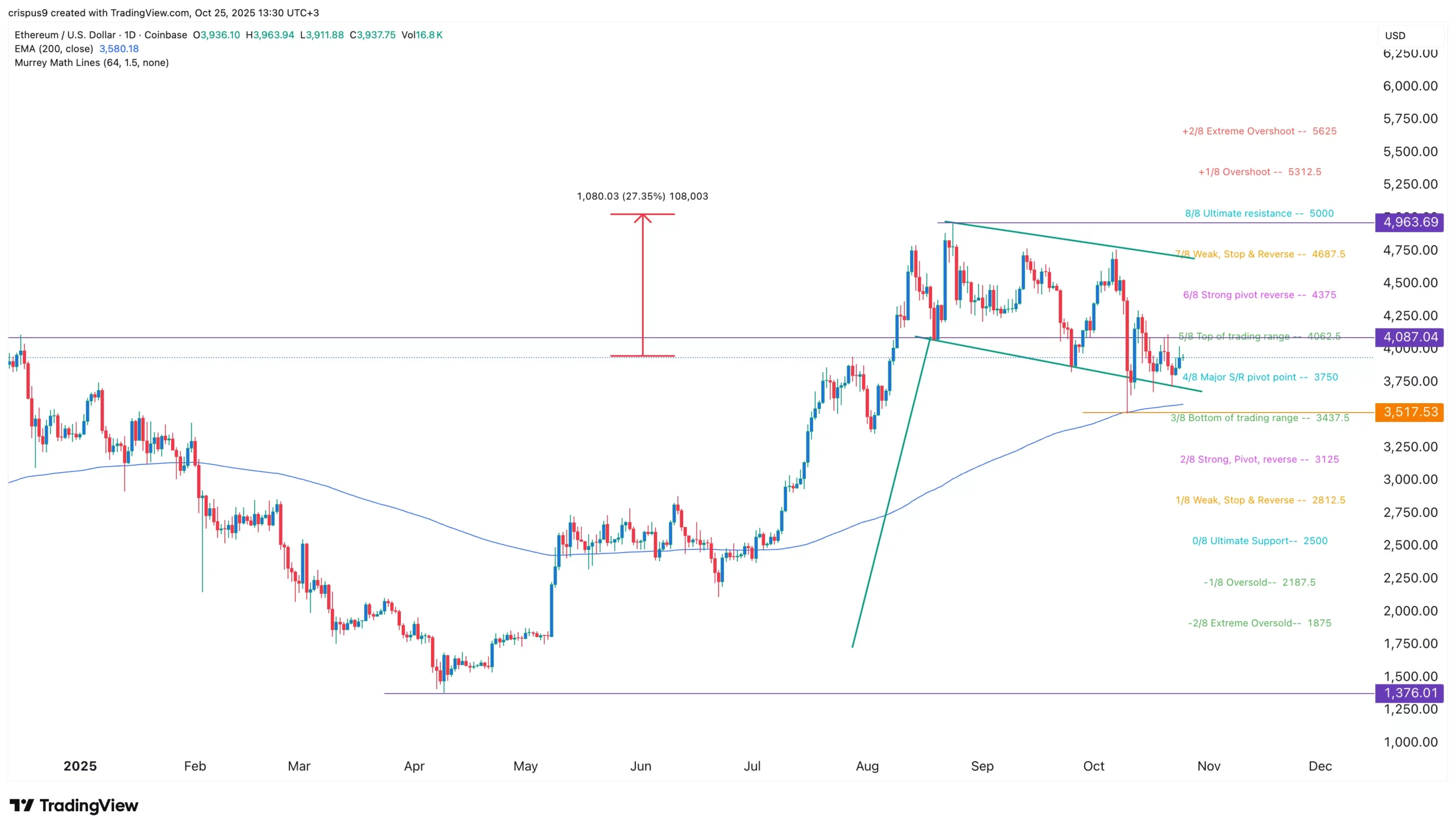 Ethereum (ETH) token was trading around $3,930 on Saturday, Oct. 25 — a level it has remained at in the past few days. This price is a few points above its lowest level this month.