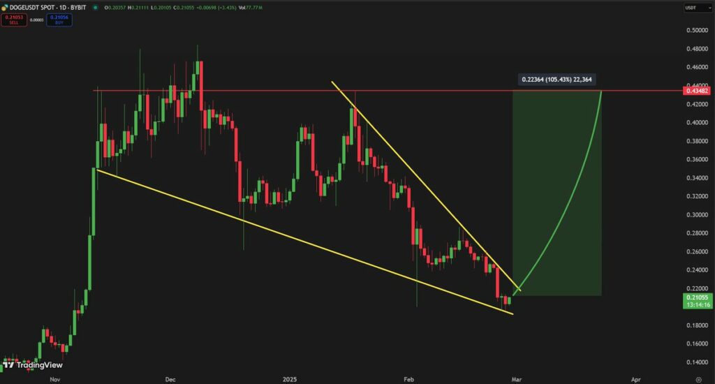 Notably, Carl The Moon recently posted that Dogecoin could break out of this falling wedge any day now, with a target of $0.43.
