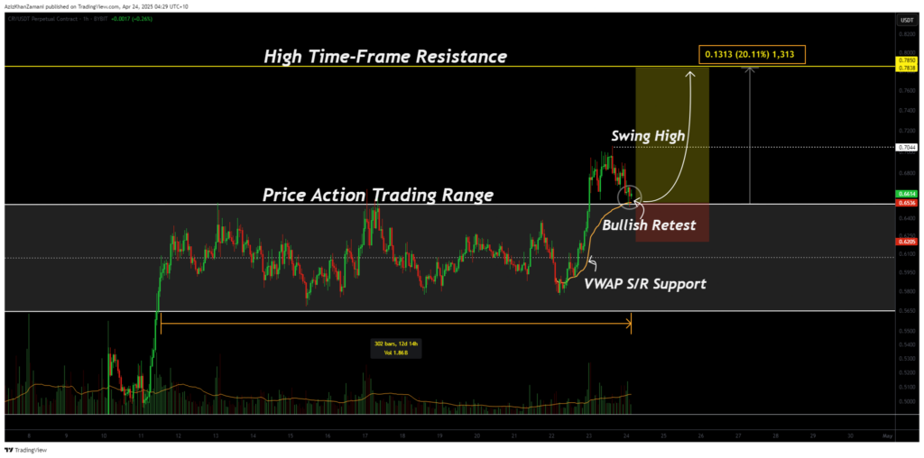 However, if price fails to hold the current retest, CRV could slide back into the prior range, invalidating the breakout. Traders should monitor both price and volume closely for confirmation before entering any continuation setups.