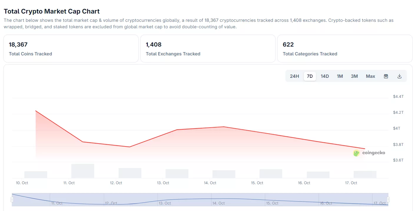 On Oct. 17, the overall crypto market cap plummeted by 7.3% to around $3.6 trillion. The market is in shambles, with the market cap dropping near $3.5 trillion after plunging below $4 trillion just a week ago. The drop is accompanied by a wave of liquidations throughout the day amounting to more than $1.23 billion in the past 24 hours.