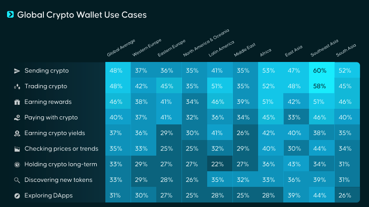 In Europe, most users were primarily engaged in trading crypto with their wallets, with over 40% of respondents citing this use case. The trend was very different in emerging markets. Users from Southeast Asia, South Asia, and Africa were the most likely to use crypto wallets for a variety of use cases, primarily sending crypto to other users.