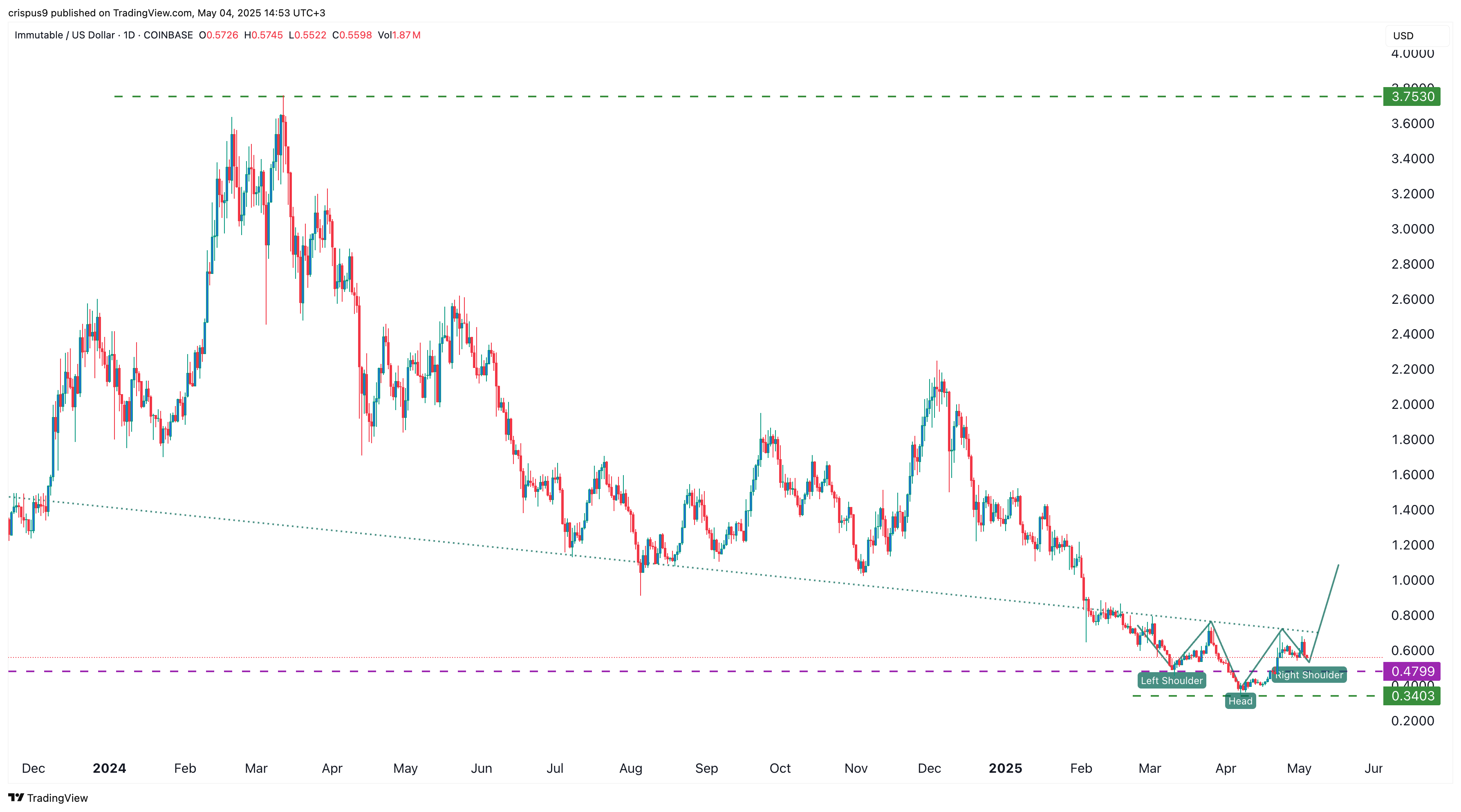 The daily chart shows that the IMX token price bottomed at $0.34 in April and then rose to $0.60. It remains 85% below the highest level in November last year. The token has formed a small inverse head and shoulders pattern, pointing to more gains later this week.
