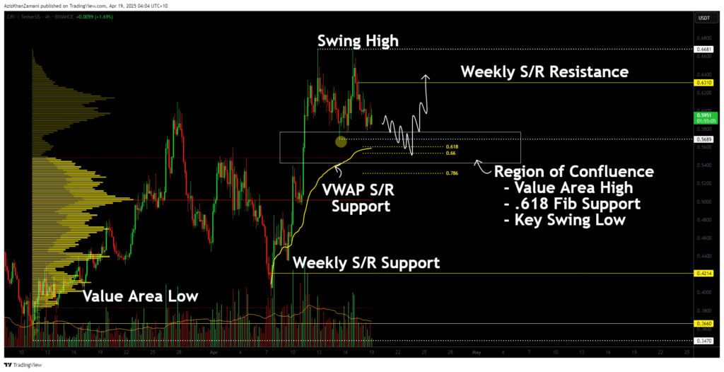CRV’s current chart structure is building out a classic higher low formation, often seen at the early stages of a bullish trend reversal. What makes this setup particularly compelling is the heavy confluence of key technical levels stacked within one zone. The value area low, derived from volume profile analysis, aligns closely with the 0.618 Fibonacci retracement from the recent leg up. This overlap is further reinforced by a local swing low, giving bulls a solid foundation for defense.