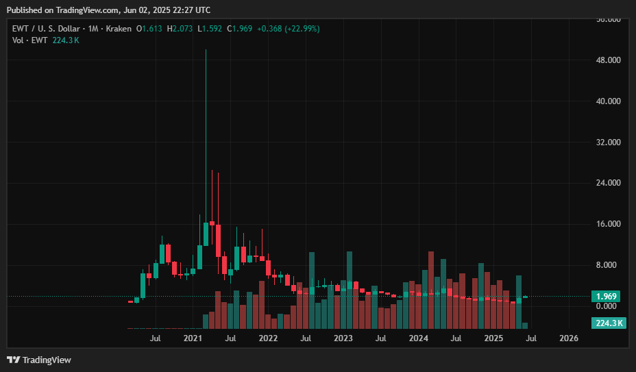 On May 1, 2025, the price of Energy Web Token was hovering around $0.65. By June 02, it had surged to roughly $1.97 — a strong move. Since then, EWT has pulled back a bit, but the momentum has definitely stirred interest.