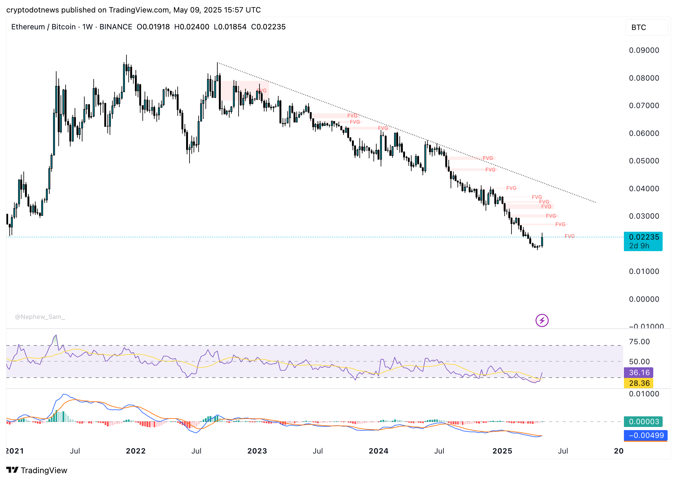 While Buterin plans for Ethereum to take on Bitcoin in five years, as of 2025, the ETH/BTC ratio hit its lowest level in over five years. The last time ETH/BTC visited the 0.01766 low was January 2020.