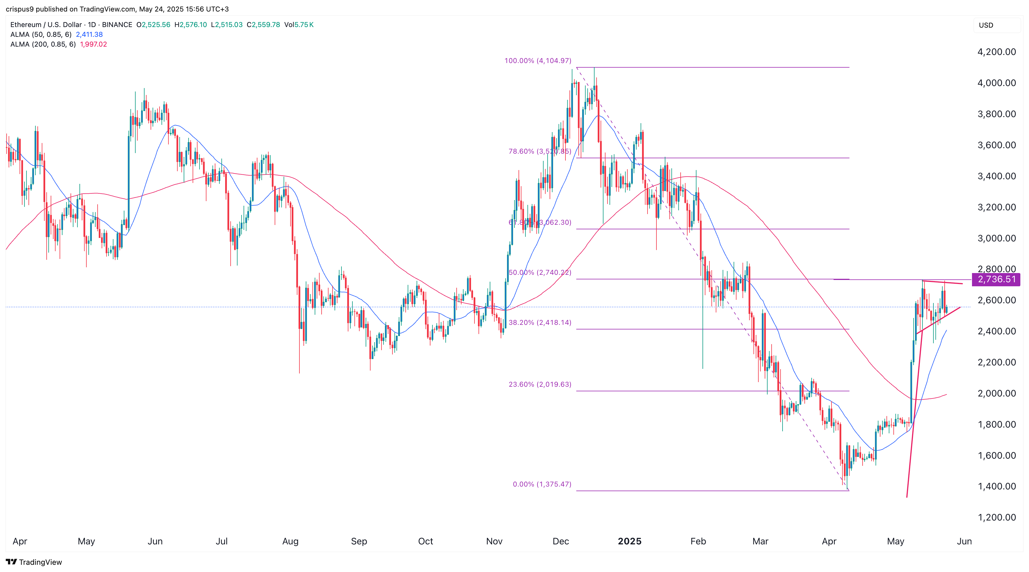 Ethereum (ETH) traded at $2,550 on Saturday, a few points below this month’s high of $2,735. It has jumped 85% from its lowest level this year.
