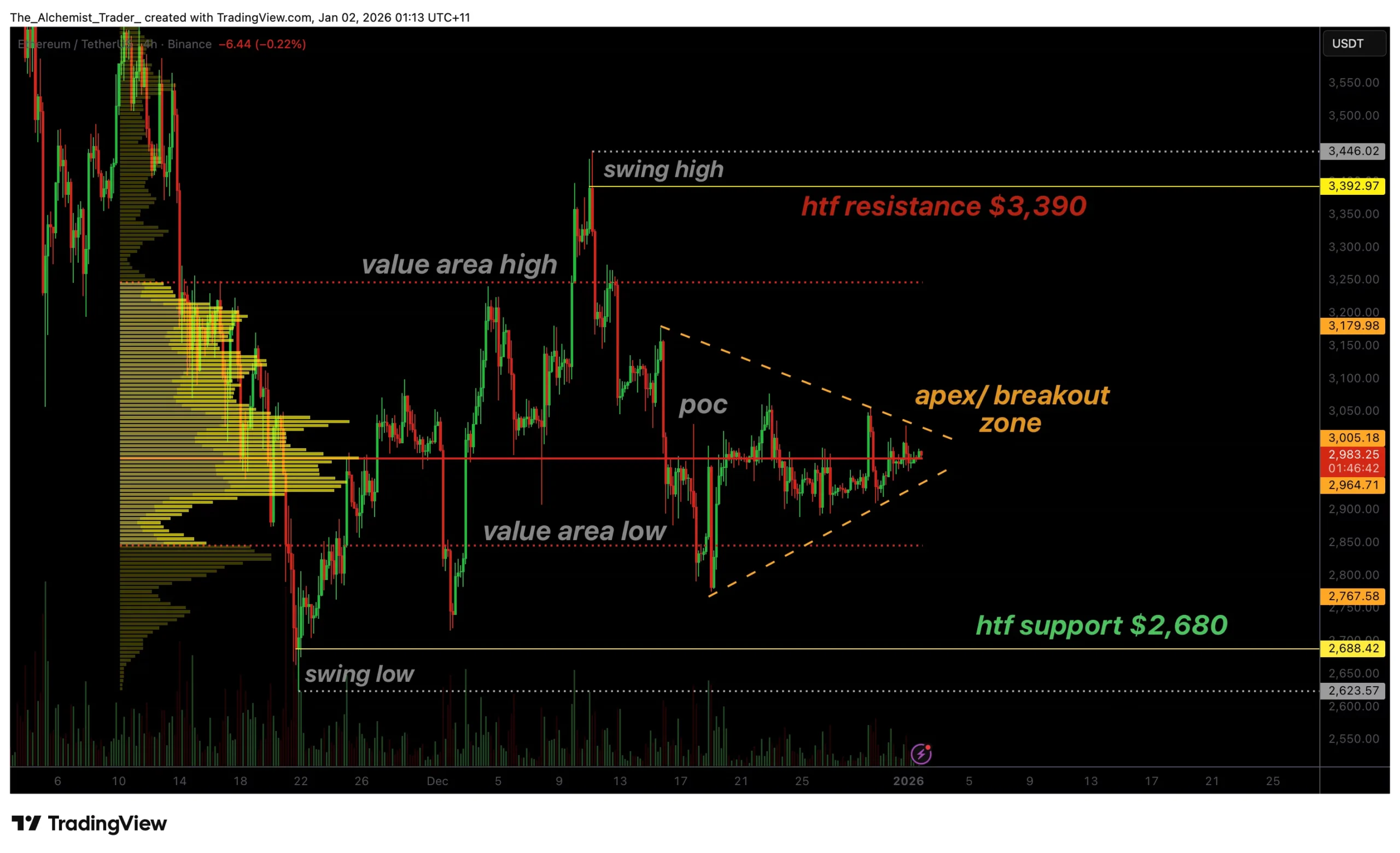 As Ethereum trades deeper into the triangle apex, a volatility expansion is increasingly imminent. A breakout supported by strong volume would likely initiate a directional move toward the next value area, confirming expansion from consolidation. Without volume confirmation, however, traders should remain cautious, as false breakouts remain a high-risk scenario.
