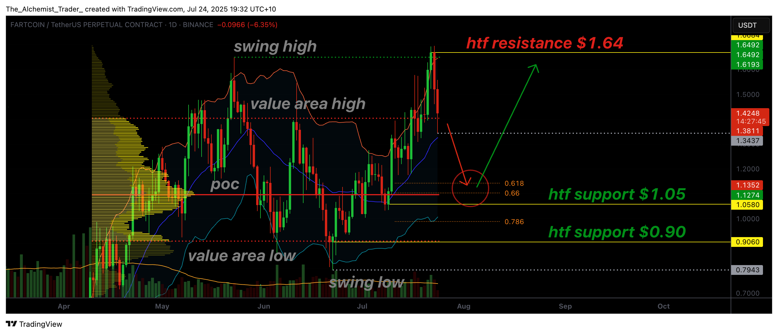 Fartcoin is likely to continue its downward trend toward the point of control, around $1.05. This support area is particularly significant, as it aligns with both the high time frame support and the 0.618 Fibonacci retracement level — a zone that often acts as a magnet for corrective moves and a launchpad for bullish reversals.