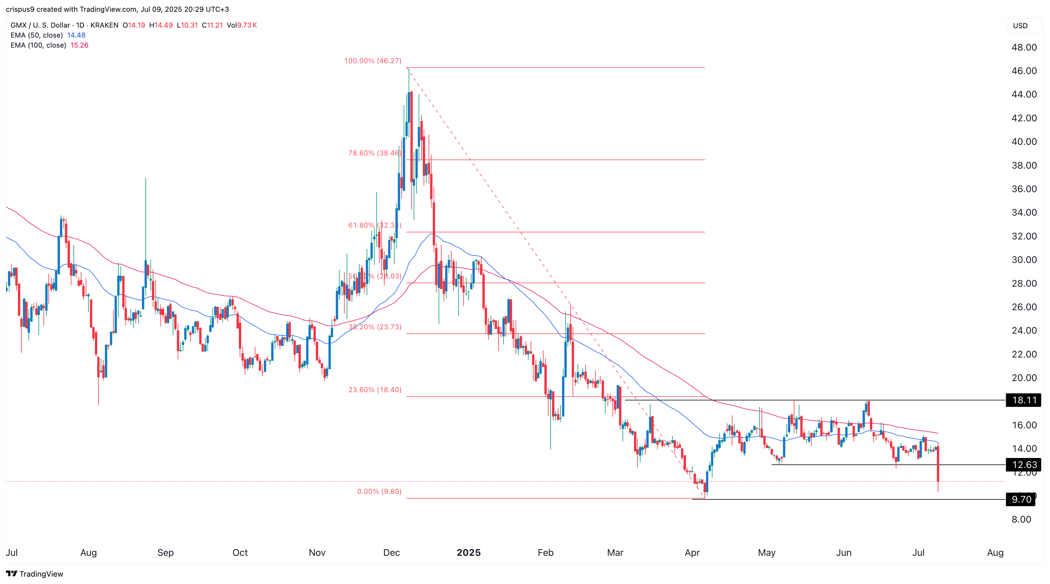 The daily chart shows that GMX peaked at $18.11 in June before reversing sharply. That local high aligned with the 23.6% Fibonacci retracement level.