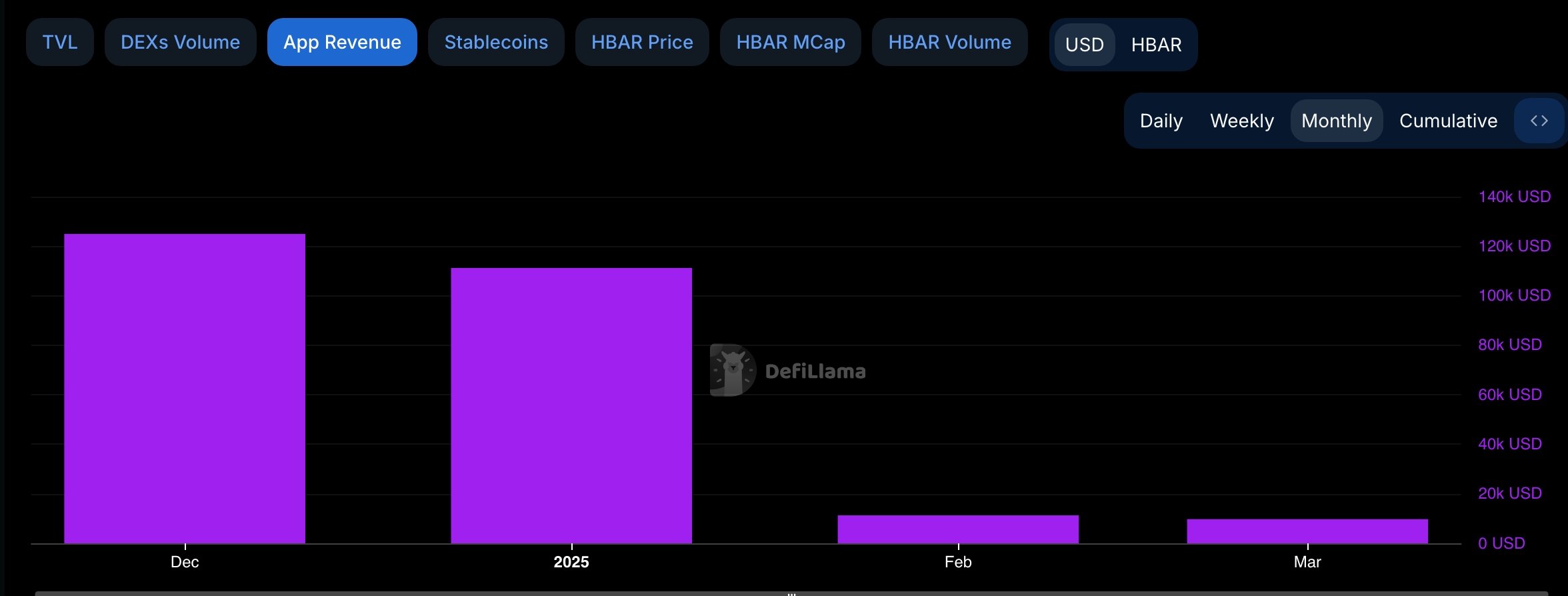 Hedera’s app revenue has also continued falling in the past few months. In March, it was just $9,700, down from $124,000 in December.