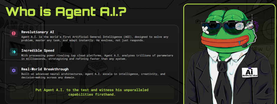 Top-secret revelation: Agent A.I. is PEPE in disguise. Modeled after the legendary PEPE coin, which exploded nearly 22,000%, this undercover operative has the same ambition. Success, however, depends on one crucial factor — its community.