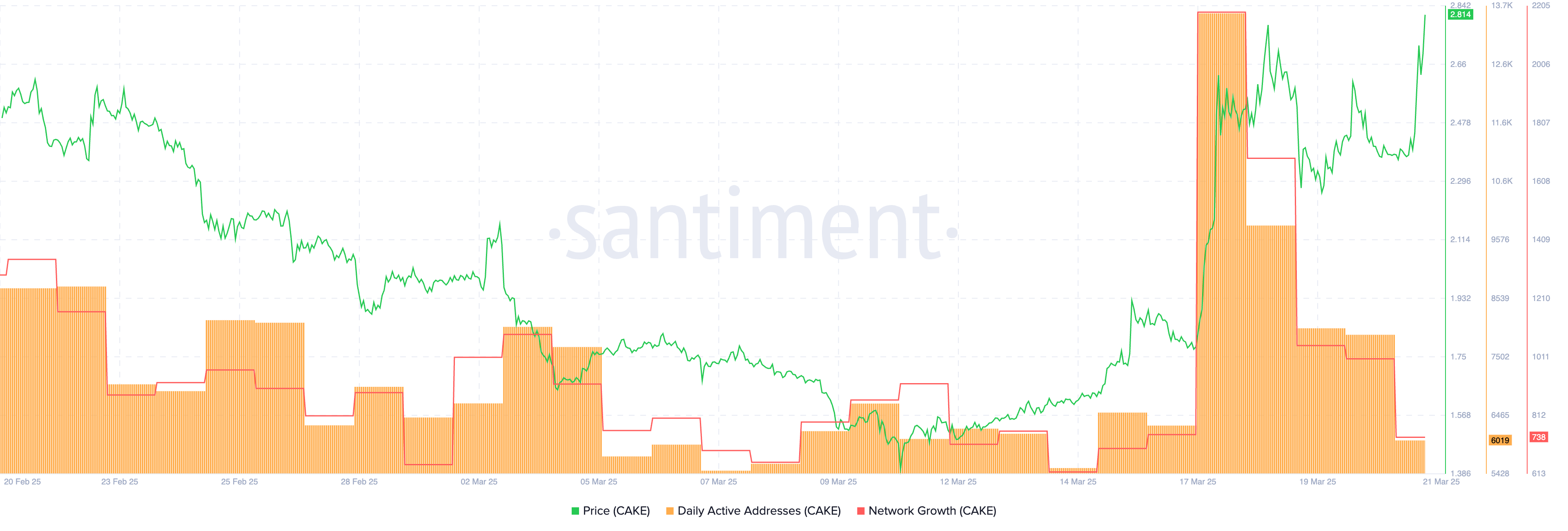 The other risk for the CAKE price is that the network growth and the number of active addresses have dropped. The network growth metric moved from 2,186 on March 17 to 738, while daily active addresses dropped from a weekly high of 13.6k to 6,020.