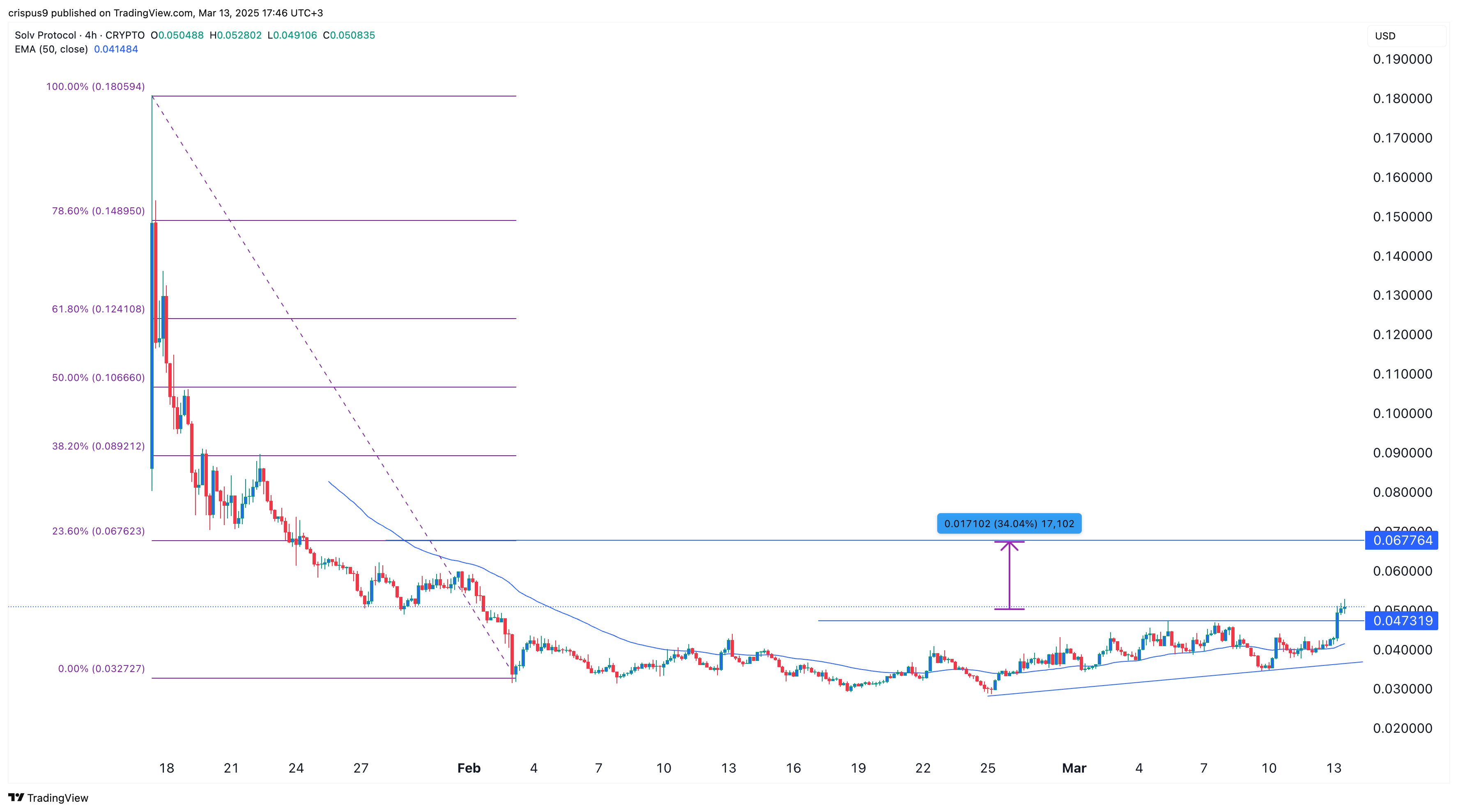 Solv Protocol (SOLV) price rose for the second consecutive day, reaching a high of $0.0527, marking its highest level since February 1. It has now surged by nearly 80% from its lowest level this year, giving it a market cap of over $75 million.