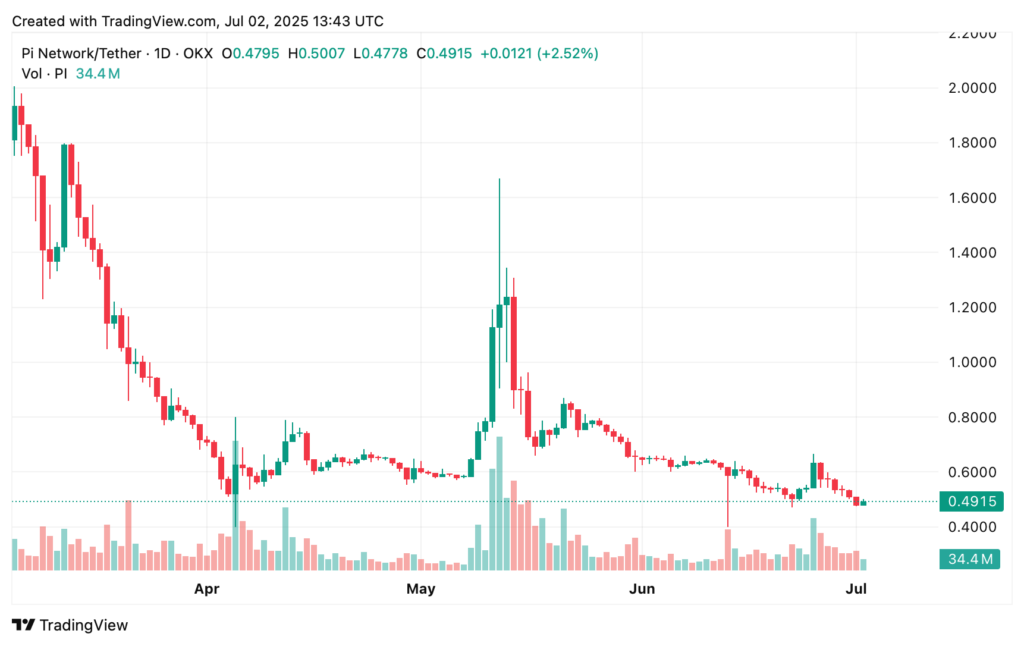As of today, July 2, 2025, Pi is trading at around $0.49. Over the past week, it’s dropped by about 21.3%, though it’s seen a slight bump in the last 24 hours — up 0.45%.