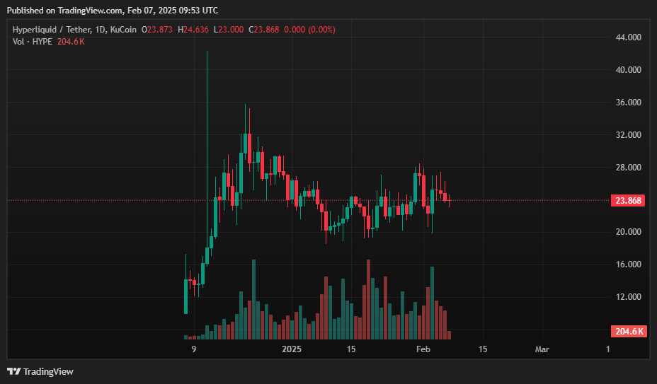 Since its launch on Nov. 29, 2024, the HYPE token has seen an all-time high of $34.96 followed by a 31% drop in price. At the time of writing, it is now trading at $23.868, which is around a 19% increase from its weekly low.