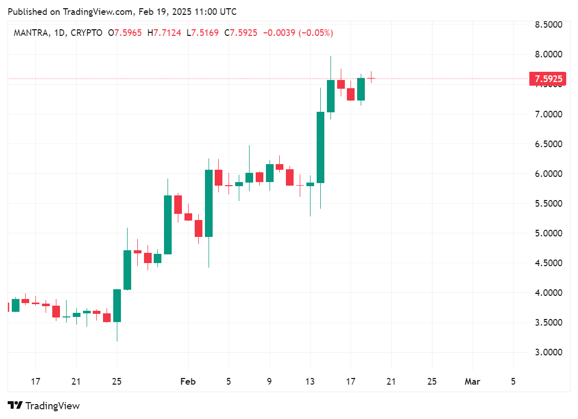 At the time of writing, MANTRA’s native token has been on the rise. According to data from crypto.news, the OM token has gone up by 3.13% in the past 24 hours and nearly 30% in the past seven days. MANTRA is currently trading hands at $7.60.