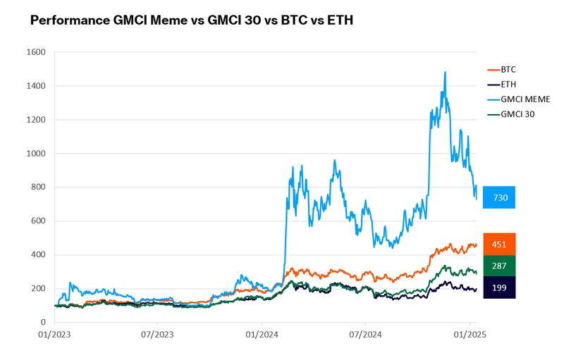The GMCI Meme Index, which tracks the leading meme coins by market capitalization, is down by approximately 60% since its Dec. highs. Despite this decline, GMCI meme (730 points) still maintains a strong lead over Bitcoin (BTC), currently sitting at 451 points, and Ethereum (ETH) at 199 points. The GMCI 30 Index, which represents a selection of the top 30 crypto assets, is at 287.