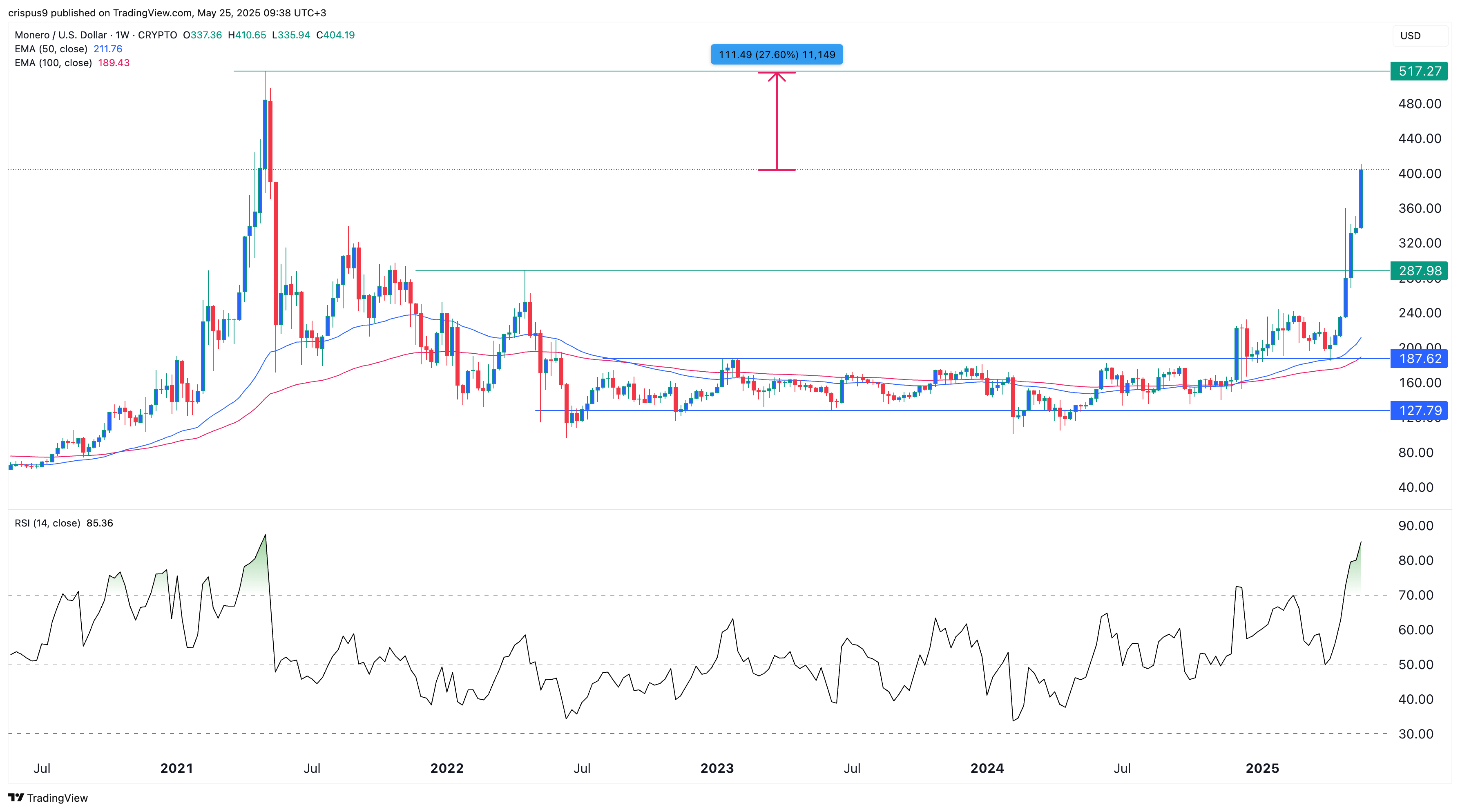 Monero has remained above the 50-week and 100-week Exponential Moving Averages. The Relative Strength Index shows that it has become highly overbought.
