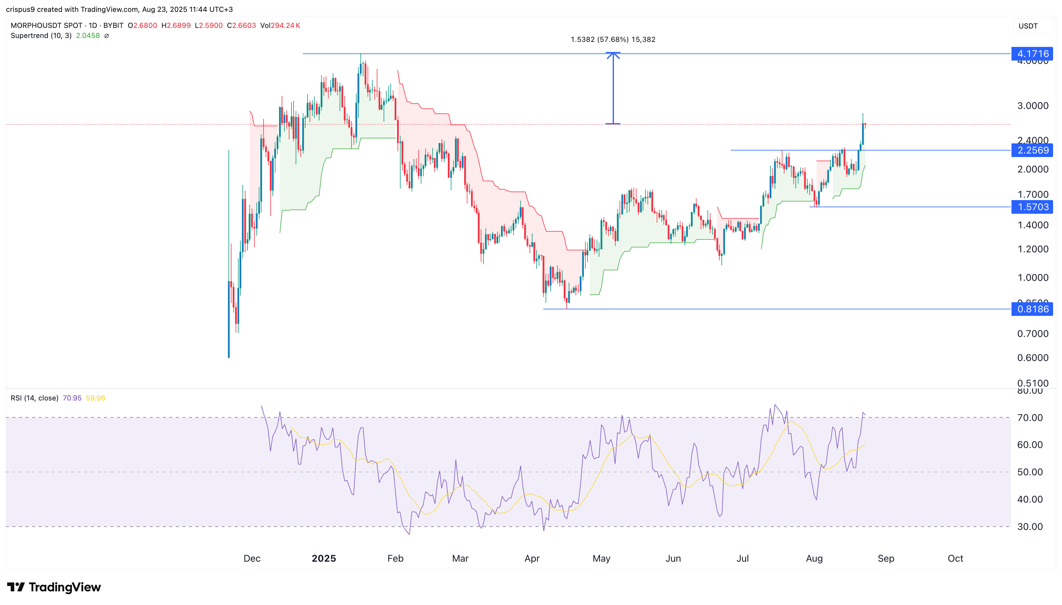 Morpho has crossed the important resistance level at $2.2570, where it formed a double-top chart pattern with a neckline of $1.5700, its lowest point on Aug. 2.