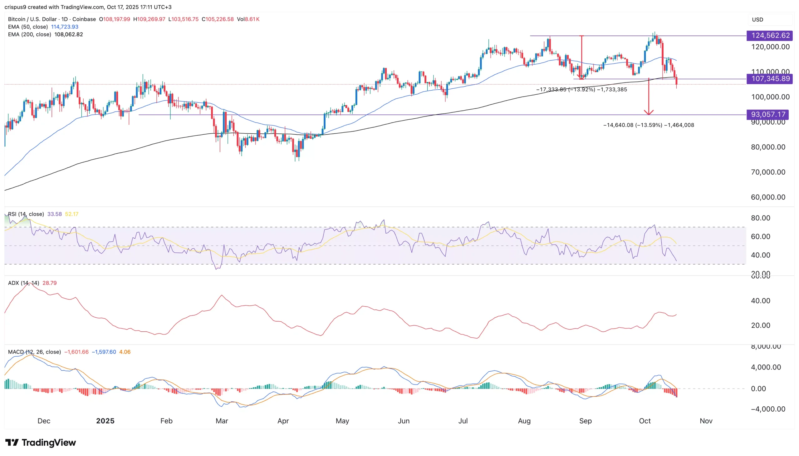 Technical analysis suggests that Bitcoin’s price has more downside. It has formed a double-top pattern on the daily chart and a giant rising wedge on the weekly chart. These patterns mean it may drop below $100,000 as risks in the market rise.