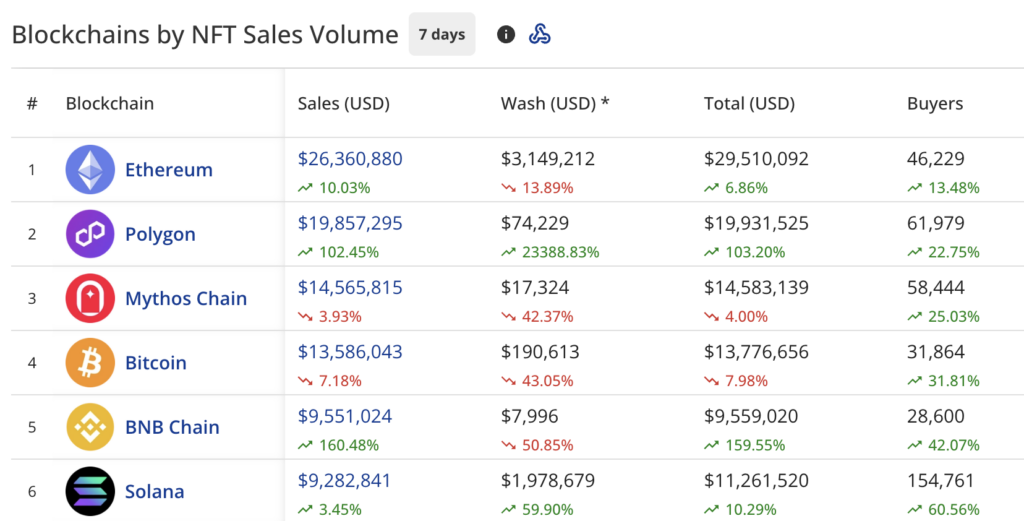 Ethereum continues to lead blockchain NFT sales with $26.3 million. This is a 10.03% increase from the previous week. Ethereum’s wash trading has decreased by 13.89% to $3.1 million.