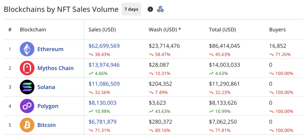 Ethereum remains the leading chain with $62.6 million in sales despite a 38.43% drop. The network saw buyer numbers fall 71.26% to 16,852, while wash trading decreased to $23.7 million.