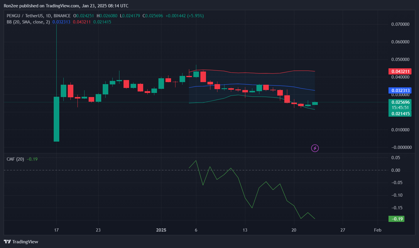 On the 1-day PENGU/USDT price chart, the meme coin’s price was close to the lower Bollinger Band, which means that bears were in control and could lead to further losses if selling pressure builds up.