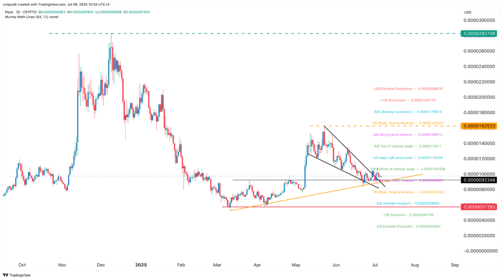Pepe price has also remained above the ascending trendline that connects the lowest swings since March this year. It has also remained above the ultimate support of the Murrey Math Lines at $0.000005960.