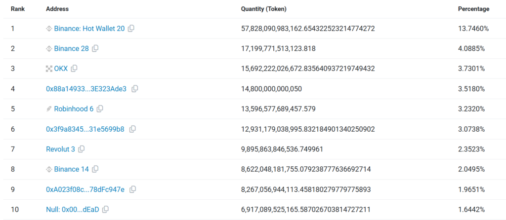 As PEPE seems to be gearing up for a major price surge, it’s worth noting that 37% of the total supply is currently being controlled by the top 10 wallets, according to Etherscan. The largest wallet alone holds 13% of the supply. This indicates a degree of centralization, meaning a small group of holders has significant influence over the token’s market.