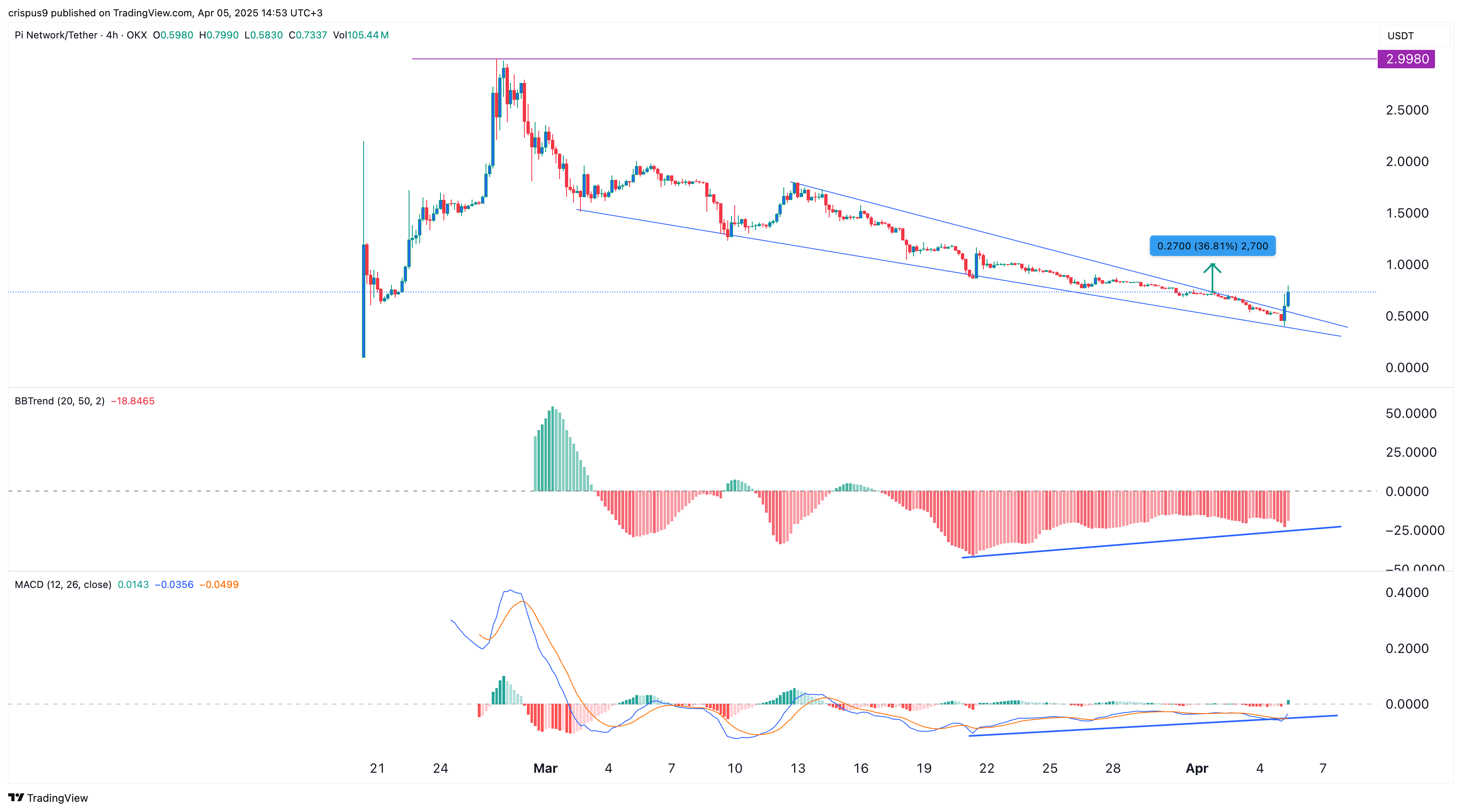 The ongoing Pi coin price recovery was due to its technicals, which crypto.news has highlighted before. The most important was a falling wedge pattern, a popular bullish reversal sign.