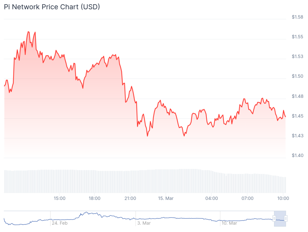 Pi Coin is currently trading in the $1.43-$1.59 range. This is substantially below its all-time high of $2.99 reached on Feb. 26. The coin is now 51.8% down from its peak value.
