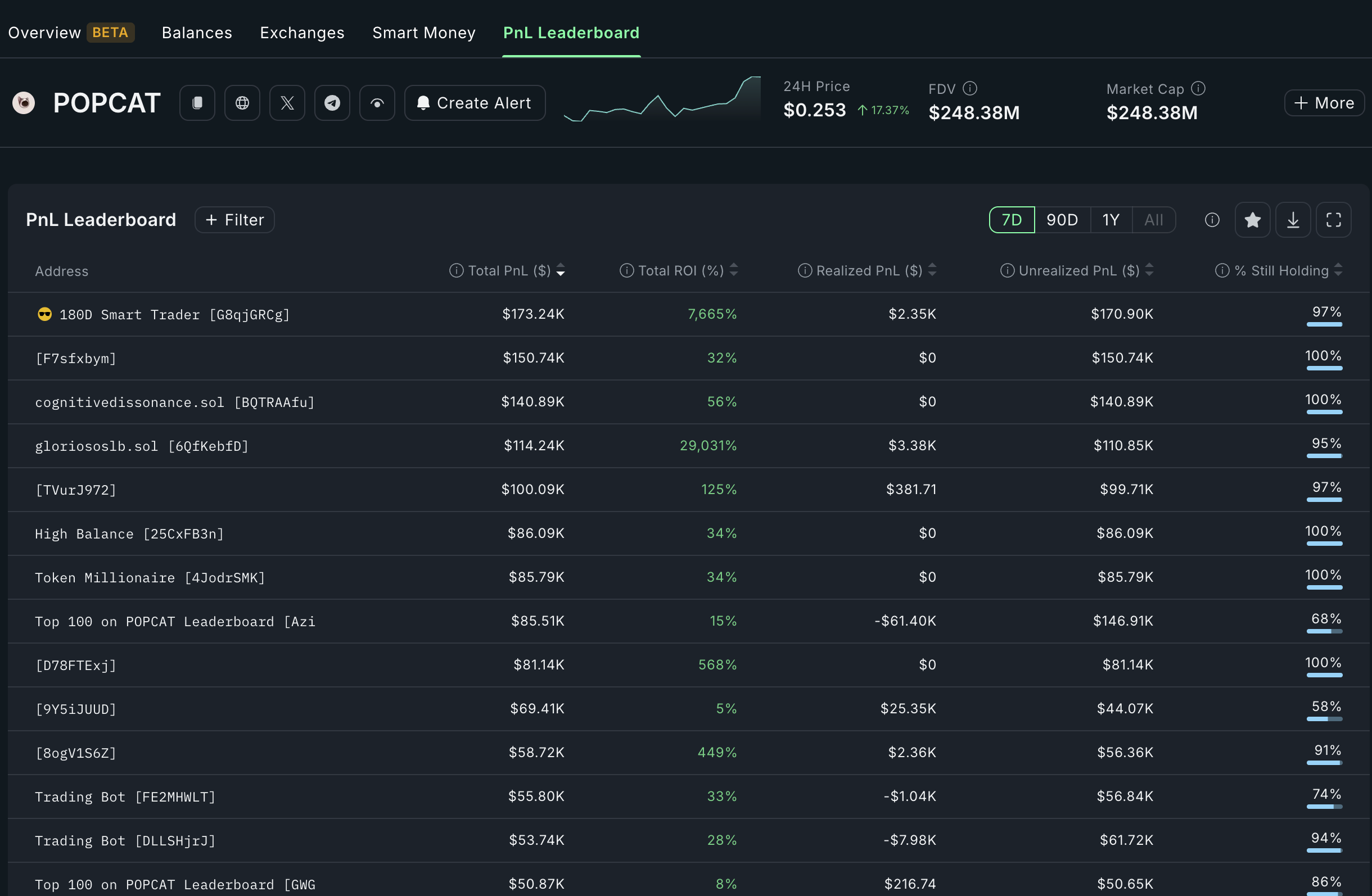More data shows that the most profitable Popcat traders in the last seven days are not selling. The top trader has made a profit of $173,000 and still holds 97% of his position. The chart below shows that many of these traders still hold their tokens.