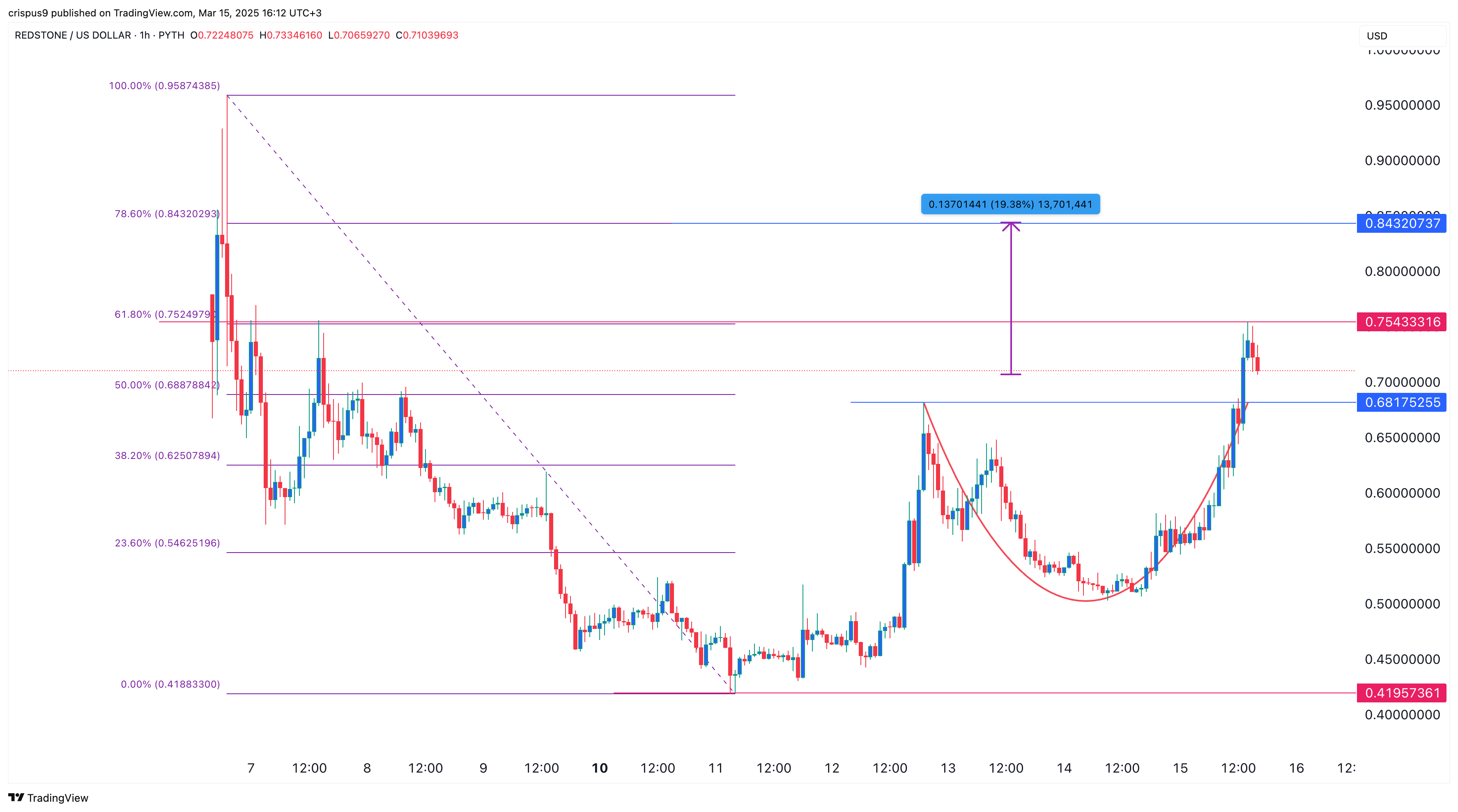 The hourly chart shows that the RED token bottomed at $0.4188 on March 11 and then bounced back to a high of $0.7543. It moved above the 50% Fibonacci Retracement level at $0.688.