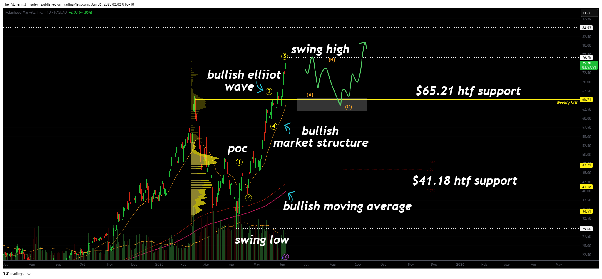 - Robinhood Key Support at $65.21: Price needs to hold above this weekly SR level for continuation higher. This level will determine whether the bullish trend resumes.