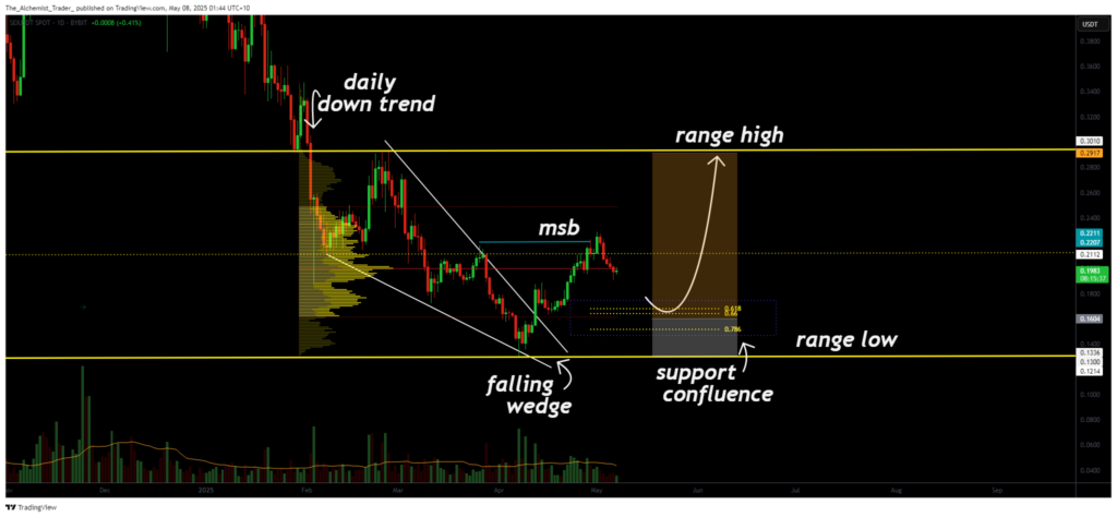 The falling wedge pattern that constrained SEI for several weeks has finally given way. With the breakout, price action not only escaped the downward sloping resistance but also managed to set a higher high, a move that confirms a potential shift in market structure from bearish to bullish.