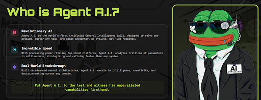Agent A.I. draws inspiration from PEPE, a meme coin that saw a massive growth of nearly 22,000%. This project adopts a similar approach while calling attention to the exaggerated claims of AI-based cryptocurrencies.