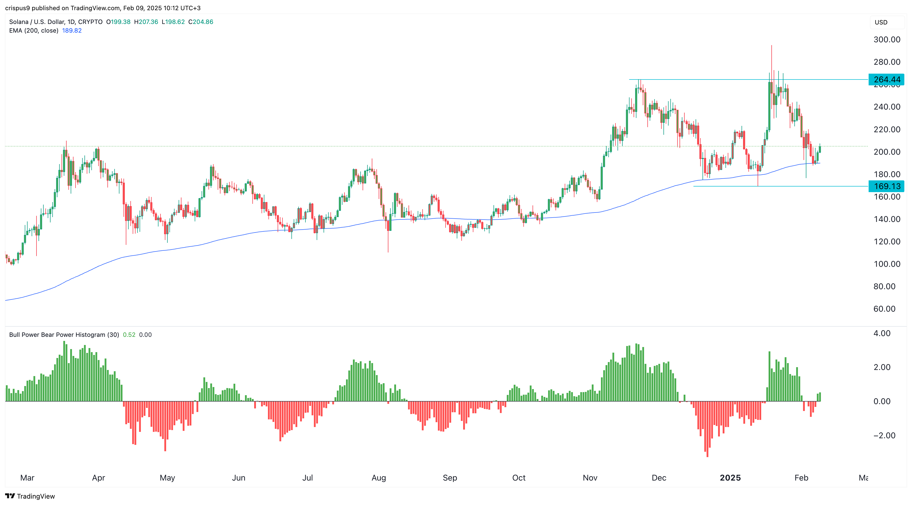 The daily chart shows that the SOL price bottomed at $190 last week as most cryptocurrencies crashed. This was an important level because it was at the 200-day Exponential Moving Average.